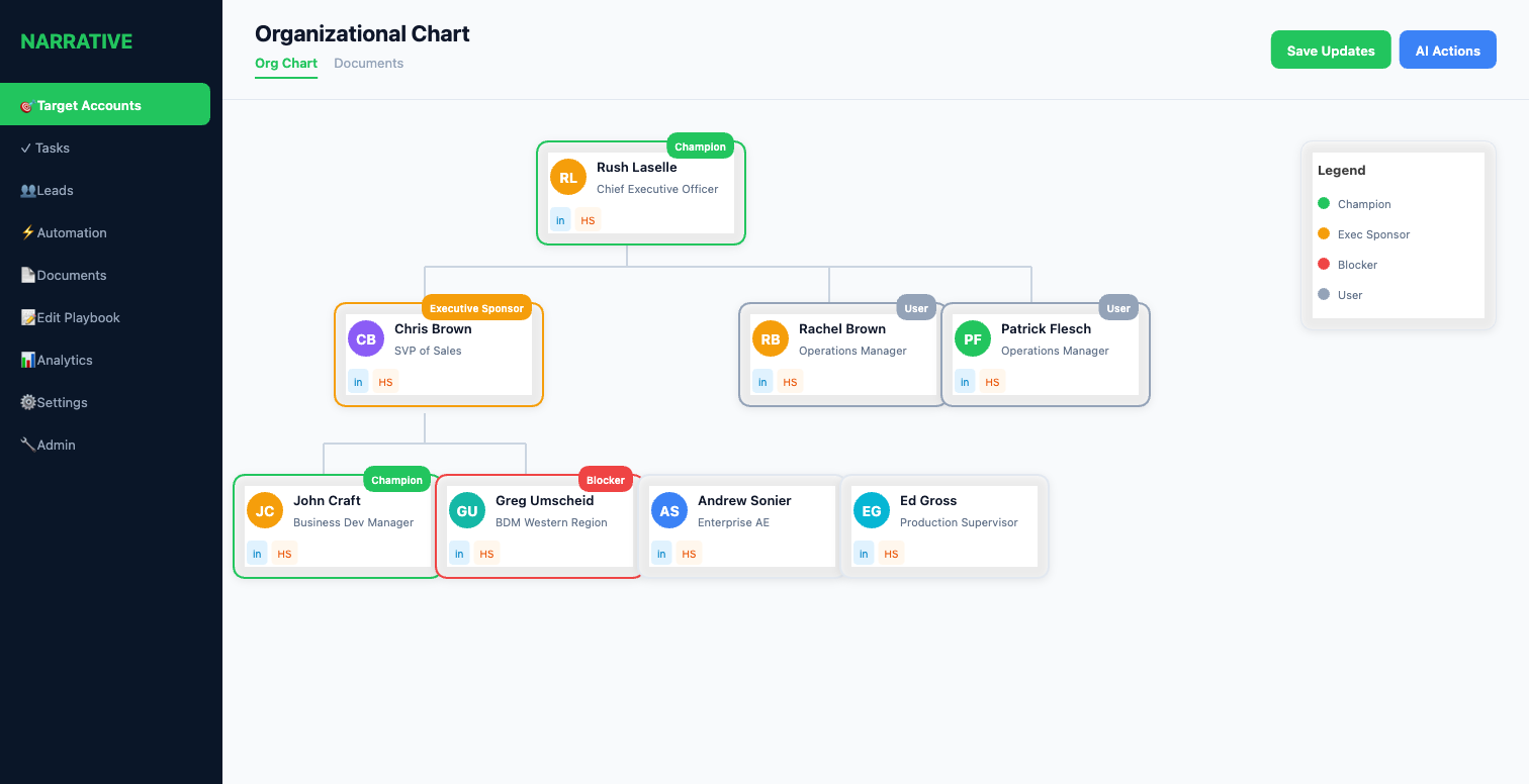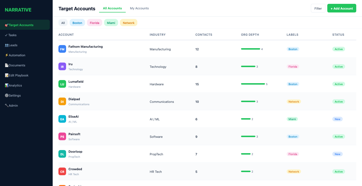 Newer reps often struggle to identify what truly matters to a C-level buyer. Narrative acts as an always-on expert assistant, instantly identifying the strategic flagpole initiatives an account is prioritizing. Generate outreach that sounds consultative and deeply informed, establishing credibility from the very first sentence.